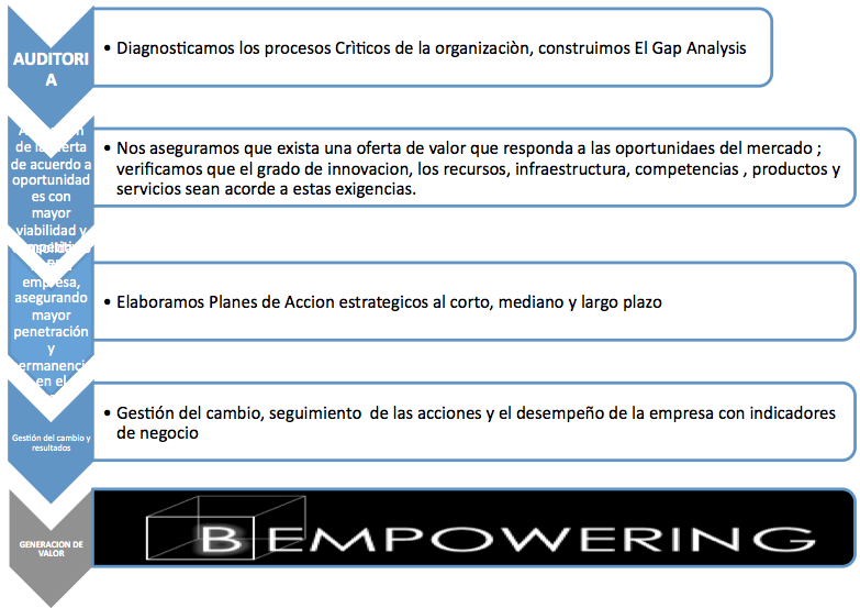 Bajo una metodología innovadora Bempowering elabora un ánalisis del entorno de la empresa, identifica los agentes de la cadena de valor asi como los clientes y consumidores actuales y potenciales, identifica las necesidades no cubiertas, establece el portafolio de productos y servicios ideal para llegar a el, desarrolla un plan de medios e implementa las acciones necesarias para en el corto plazo captar la atención de un mayor numero de consumidores incrementando la penetración de nuestros clientes en sus respectivos mercados.